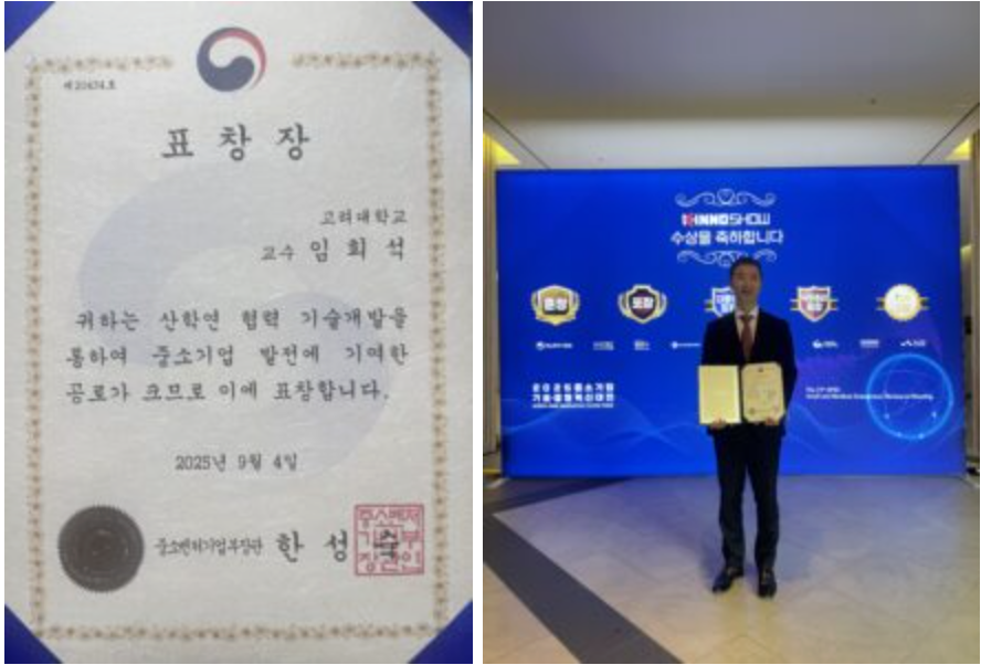 본 연구실의 임희석 교수님이 산학연 협력 기술개발을 통해 중소기업의 기술애로 해소 및 산학연 협력 활성화에 기여한 공로를 인정받아 중소벤처기업부 장관 표창을 수상하였습니다.(https://hiai.korea.ac.kr/award/?mod=document&uid=202)